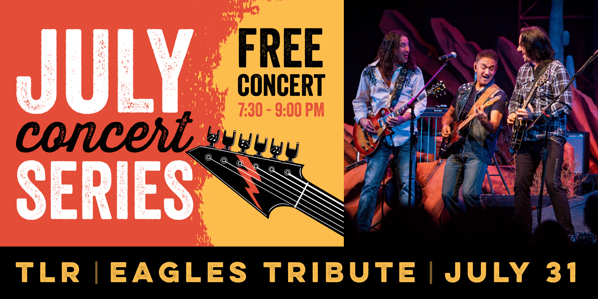 Experience the Eagles' music with TLR, performing July 31st at Mountain Grove Shopping Centers, compliments of Mountain Grove, Citrus Plaza, and Majestic Retail.